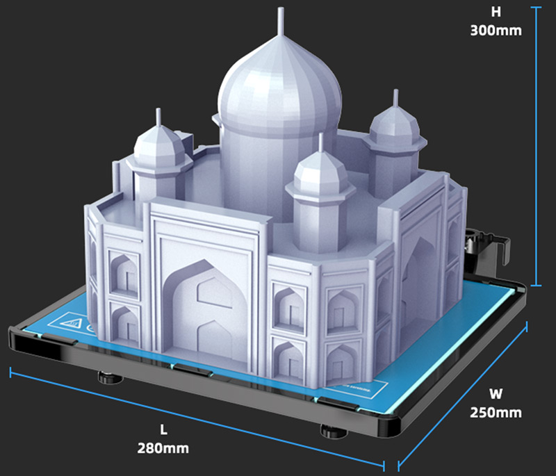 Область построения составляет 280*250*300 мм, что позволяет печатать модели целиком без дальнейшего склеивания.